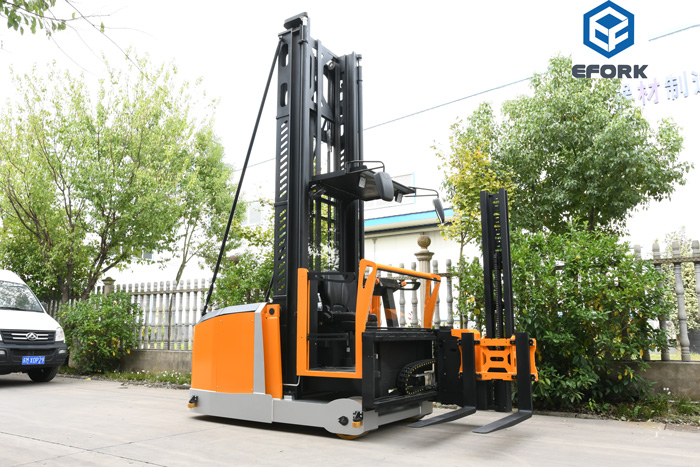 The three-way stacker forklift has a powerful high-position operation performance. The rated load and lifting height can be customized according to customer needs, rated load of 1500KG,  with the highest lifting height reaching 14.5 meters, meeting the stacking requirements of goods on high-position racks. The design of the operator following the forklift up allows the operator to have a panoramic view and pick goods manually while stacking, realizing the dual function of the stacker forklift and effectively improving operation efficiency.