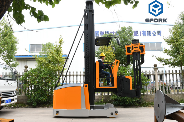 The three-way forklift's forks can be moved left and right and rotated 180°. They can pick up and stack goods without turning in extremely narrow aisles. In addition, the ergonomic design of the integrated operation handlebar and other excellent human-machine engineering features simplify the operation process and improve driving comfort.